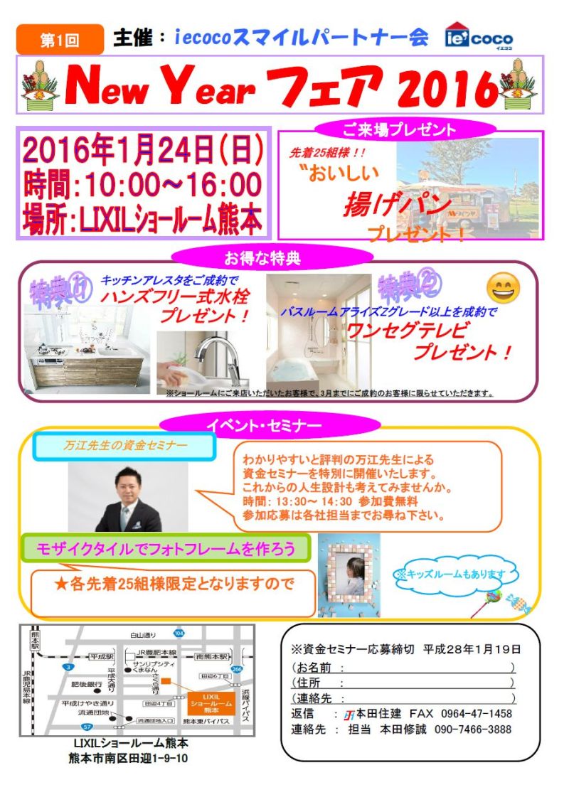 私たちは年明けのイベントに向けて準備を進めています。iecoco(イエココ)スマイルパートナー4社合同フェアを開催LIXIL熊本を会場に開催いたします!1月24日(日曜)