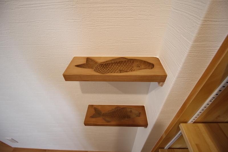 倉庫にお菓子の型が残っていたので、磨き上げ和室に飾りとして、玄関に鍵置きとして取り付けさせて頂きました。粋な計らいにお施主様からも喜んで頂けました。